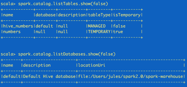 //fetch metadata data from the catalog`` ``spark.catalog.listDatabases.show(``false``)`` ``spark.catalog.listTables.show(``false``)