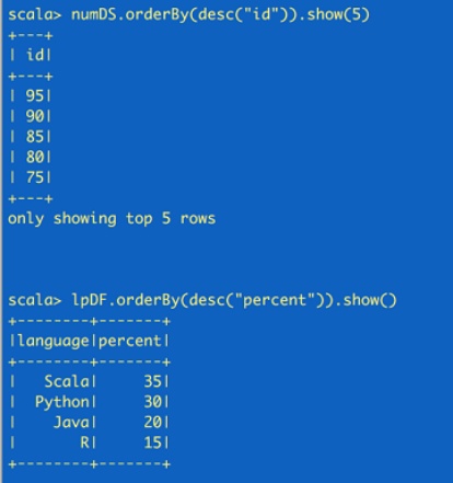 //create a Dataset using spark.range starting from 5 to 100, with increments of 5``val numDS = spark.range(``5``, ``100``, ``5``)``//创建dataset``// reverse the order and display first 5 items``numDS.orderBy(desc(``"id"``)).show(``5``)``//compute descriptive stats and display them``numDs.describe().show()``// create a DataFrame using spark.createDataFrame from a List or Seq``val langPercentDF = spark.createDataFrame(List((``"Scala"``, ``35``), (``"Python"``, ``30``), (``"R"``, ``15``), (``"Java"``, ``20``)))``//创建dataframe``//rename the columns``val lpDF = langPercentDF.withColumnRenamed(``"_1"``, ``"language"``).withColumnRenamed(``"_2"``, ``"percent"``)``//order the DataFrame in descending order of percentage``lpDF.orderBy(desc(``"percent"``)).show(``false``)